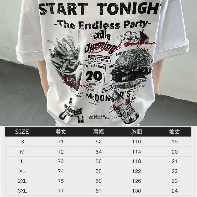 選べる2カラー・6サイズ!フライドポテトとハンバーガープリントがインパクト大で目を惹く半袖Tシャツです。