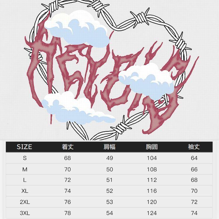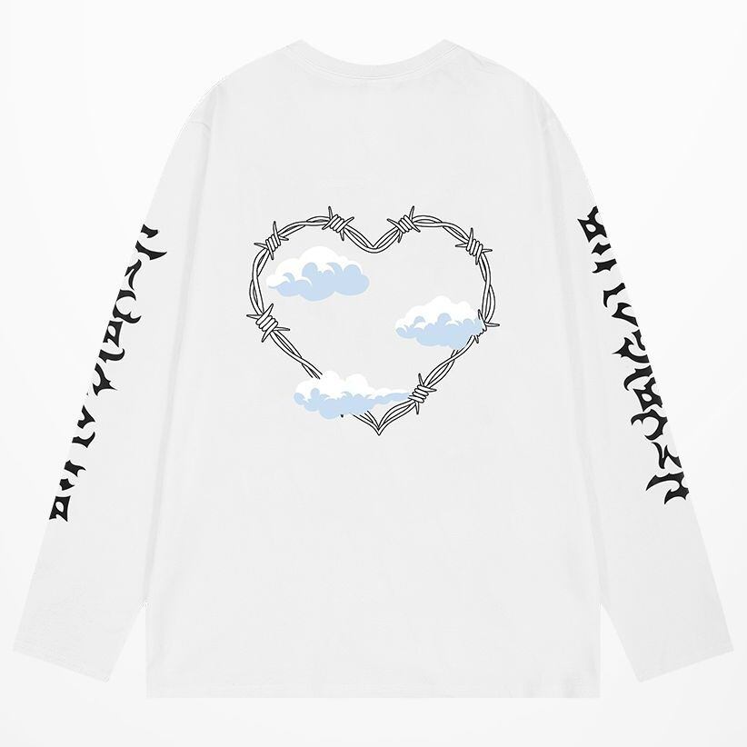 ユニセックスで着れる2カラー・6サイズ!有刺鉄線のハート&雲と袖プリントがインパクト大の長袖Tシャツです。