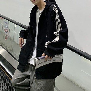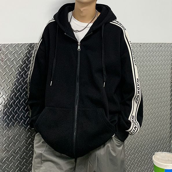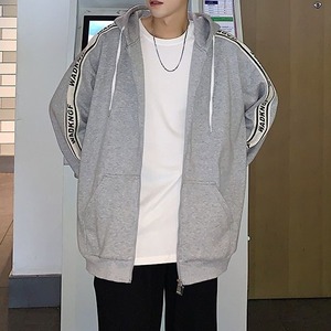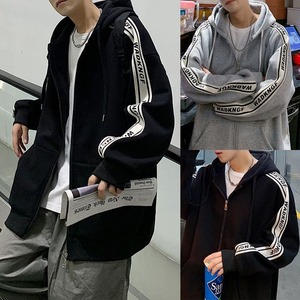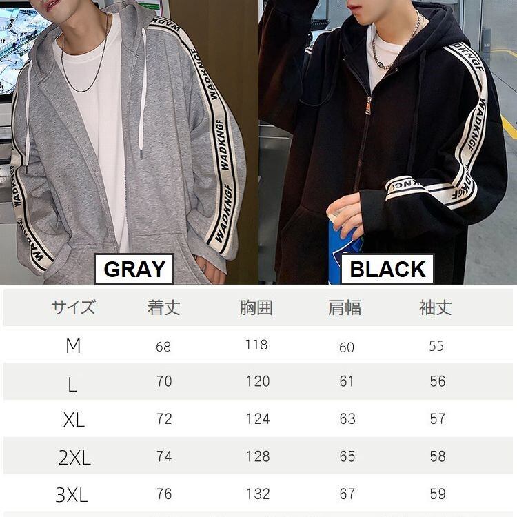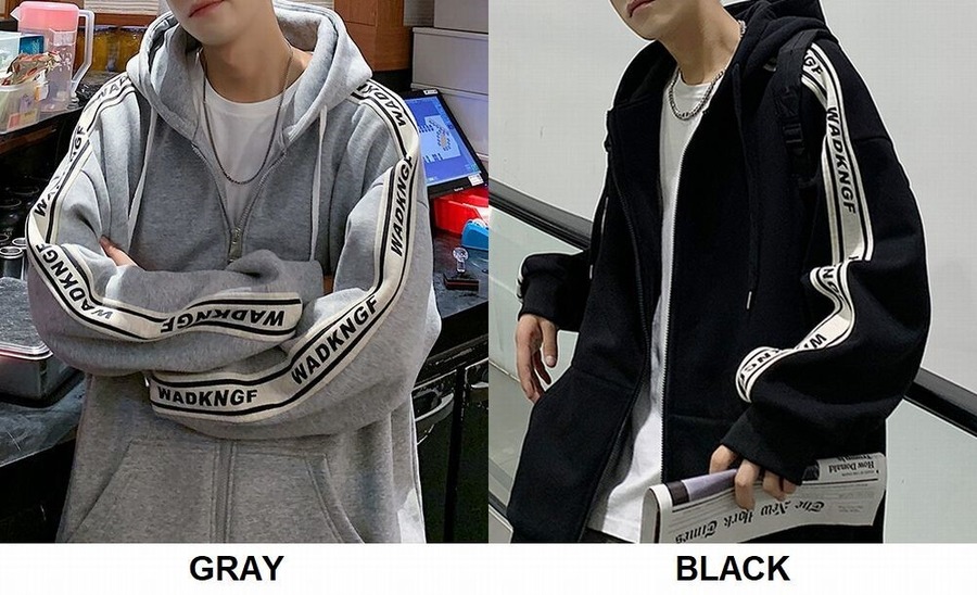 ユニセックスで着れる2カラー・5サイズ!袖ライン&英字が目を惹くジップアップパーカーです。
