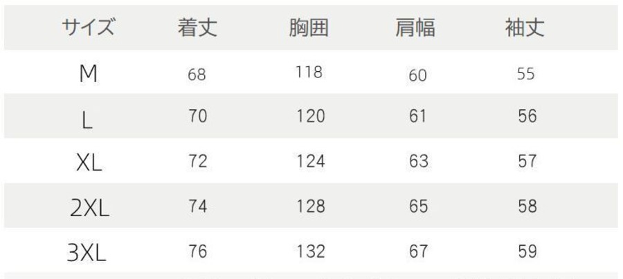 着丈:68cm、胸囲:118cm、肩幅:60cm、袖丈:55cm